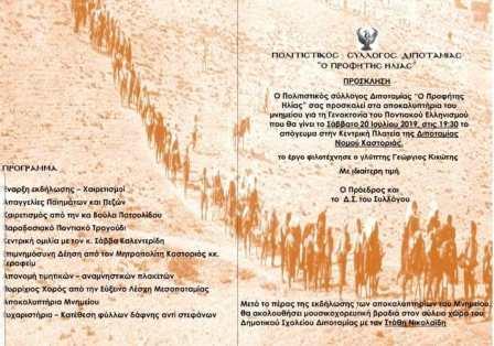 Τα αποκαλυπτήρια του μνημείου της Γενοκτονίας των Ελλήνων του Πόντου, το οποίο φιλοτέχνησε ο γλύπτης Γεώργιος Κικώτης θα πραγματοποιήσει ο πολιτιστικός σύλλογος Διποταμιάς «Ο Προφήτης Ηλίας», το Σάββατο 20 Ιουλίου 2019, στις 19.30 το βράδυ στην κεντρική πλατεία της Διποταμιάς του νομού Καστοριάς.