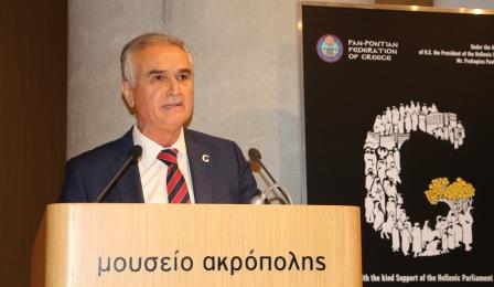 Μια Τουρκία που συνεχίζει να έχει επιθετική και επεκτατική στρατηγική εναντίον της Κύπρου και της Ελλάδας. Μια Τουρκία που νιώθει δικαιωμένη για τις γενοκτονίες που διέπραξε. Μια “δικαίωση” που της ανοίγει διάπλατα το δρόμο για τις απαράδεκτες διεκδικήσεις της. Σας συγχαίρω λοιπόν για την πρωτοβουλία σας. Που αποδεικνύει, για μία ακόμη φορά, πως από όλες τις προσφυγικές πληθυσμιακές ομάδες του Ελληνικού κράτους, οι Πόντιοι, είναι αυτοί που εμφανίζουν την ισχυρότερη δυναμική στην αναπαραγωγή των ηθών και των εθίμων τους και τη διατήρηση της μνήμης των θλιβερών γεγονότων που είχαν σαν κατάληξη τον αναγκαστικό εκπατρισμό.