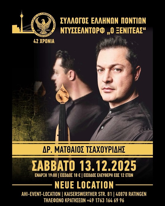 Μία μοναδική βραδιά με μουσικές και ακούσματα του Ευξείνου Πόντου, υπόσχεται ο Σύλλογος Ελλήνων Ποντίων Ντύσσελντορφ «ο Ξενιτέας» το βράδυ του Σαββάτου 13 Δεκεμβρίου 2025, με τον μοναδικό Ματθαίο Τσαχουρίδη.