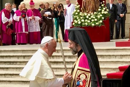 «Κατ’ αρχάς θα ήθελα να εκφράσω τις ευχαριστίες μου για την ευγενική πρόσκληση του Βατικανού να παραβρεθούμε στην Θρονική εορτή στον Άγιο Πέτρο. Η παραμονή μας στη Ρώμη για τις ανάγκες της Γενικής Συνέλευσης της ΔΣΟ, και η δυνατότητα να έλθουμε σε επαφή και να ανταλλάξουμε απόψεις με παράγοντες του καθολικισμού, κληρικούς και λαϊκούς, ήταν εξαιρετικά χρήσιμη για όλους. Όπως είχαμε την ευκαιρία να δηλώσουμε και στη διάρκεια των εργασιών της Γενικής Συνέλευσης και στις κατ’ ιδίαν συναντήσεις, η επιλογή μας να έλθουμε στη Ρώμη αποσκοπούσε στο να στείλει ένα μήνυμα συνεργασίας και συνεννόησης όλου του χριστιανικού κόσμου για την αντιμετώπιση των σύγχρονων προκλήσεων.