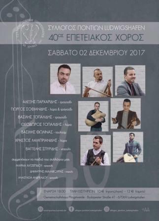 Τον ετήσιο χορό του διοργανώνει ο σύλλογος Ποντίων Λούτβισχάφεν της Γερμανίας, το Σάββατο 2 Δεκεμβρίου 2017 και οι διοργανωτές υπόσχονται ένα γνήσιο ποντιακό γλέντι.