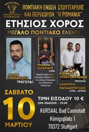 Τον ετήσιο χορό της διοργανώνει η Ποντιακή Ένωση Στουτγάρδης και Περιχώρων «Η Ρωμανία» το βράδυ του Σαββάτου 10 Μαρτίου 2018, και υπόσχεται ένα γνήσιο ποντιακό γλέντι σε όλους όσους πάρουν μέρος στην μυσταγωγία της ποντιακής μουσικής παράδοσης.