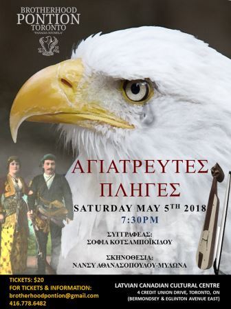 Την Θεατρική Παράσταση «Αγιάτρευτες Πληγές» παρουσιάζει η Αδελφότητα Ποντίων Τορόντο «Παναγία Σουμελά», και προσκαλεί τα μέλη και τους φίλους του συλλόγου, σε μια ξεχωριστή βραδιά θεάτρου, το Σάββατο 5 Μαΐου και ώρα 7:30 μμ , στο Latvian Canadian Centre (4 Credit Union Drive – Bermondsey & Eglinton Ave E.).