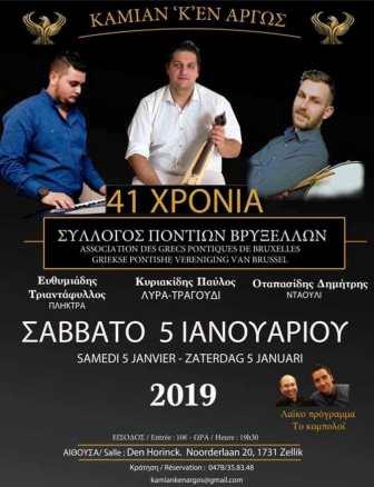 Τα σαρανταένα χρόνια λειτουργίας του, γιορτάζει ο σύλλογος Ποντίων Βρυξελών «Καμίαν ‘κ’ έν’ αργώς», και διοργανώνει τον ετήσιο χορό του, το Σάββατο 5 Ιανουαρίου 2019, και με ανακοίνωσή του, προσκαλεί τα μέλη και τους φίλους του συλλόγου, αλλά και όλον τον ελληνισμό, να παρευρεθούν και να γλεντήσουν με τους ήχους της λύρας, του νταουλιού, αλλά και ελληνικού προγράμματος.