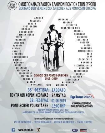 Το 38ο φεστιβάλ ποντιακών χορών νεολαίας της Ομοσπονδίας Συλλόγων Ελλήνων Ποντίων στην Ευρώπη, το οποίο θα πραγματοποιηθεί το Σάββατο 1 Ιουνίου 2019, είναι αφιερωμένο στα 100 χρόνια μνήμης της γενοκτονίας των Ελλήνων του Πόντου, φεστιβάλ τιμής και μνήμης, 1919 – 2019.