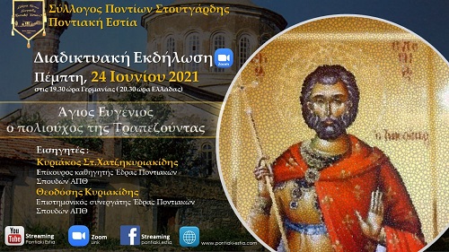 Διαδικτυακή εκδήλωση με θέμα «Άγιος Ευγένιος, ο πολιούχος της Τραπεζούντας» και με εισηγητές τους Κυριάκο Χατζηκυριακίδη και Θεοδόση Κυριακίδη, διοργανώνει ο Σύλλογος Ποντίων Στουτγάρδης «Ποντιακή Εστία», την Πέμπτη 24 Ιουνίου.