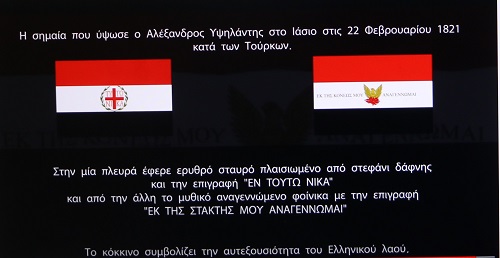 Η σημαία που ύψωσε ο Αλέξανδρος Υψηλάντης στο Ιάσιο στις 22 Φεβρουαρίου 1821 κατά των Τούρκων. Στην μία πλευρά έφερε ερυθρό σταυρό πλαισιωµένο από στεφάνι δάφνης και την επιγραφή "ΕΝ ΤΟΥΤΩ ΝΙΚΑ" και από την άλλη το µυθικό αναγεννώµενο φοίνικα µε την επιγραφή "ΕΚ ΤΗΣ ΣΤΑΚΤΗΣ ΜΟΥ ΑΝΑΓΕΝΝΩΜΑΙ" Το κόκκινο συμβολίζει την αυτεξουσιότητα του Ελληνικού λαού, το άσπρο το δίκαιο της επανάστασης κατά της τυραννίας και το μαύρο την απόφαση των σκλαβωμένων να πολεμήσουν και να πεθάνουν για την ελευθερία τους