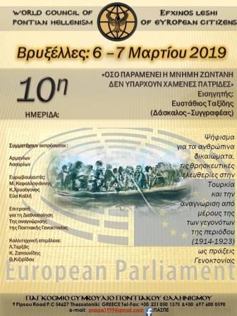Στις Βρυξέλες βρίσκεται από την Τρίτη 5 Μαρτίου 2019, αποστολή του Παγκόσμιου Συμβουλίου Ποντιακού Ελληνισμού (ΠΑΣΠΕ) και της Ευξείνου Λέσχης Ευρωπαίων Πολιτών, προσκεκλημένοι της Ευρωβουλευτού του ΚΙΝΑΛ Εύας Καϊλή, για να πάρουν μέρος σε σειρά ημερίδων στο Ευρωπαϊκό Κοινοβούλιο.