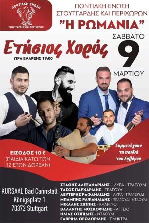 Τον ετήσιο χορό της διοργανώνει η Ποντιακή Ένωση Στουτγάρδης και Περιχώρων «Η Ρωμανία», το Σάββατο 9 Μαρτίου 2019, και προσκαλεί τα μέλη και τους φίλους του συλλόγου να παρευρεθούν στην εκδήλωση και να γλεντήσουν στους ρυθμούς του αλησμόνητου Πόντου.