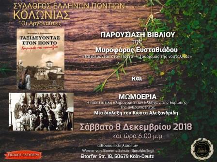 Επιτυχημένη ήταν η εκδήλωση που πραγματοποίησε το Σάββατο 8 Δεκεμβρίου 2018, ο Ποντιακός Σύλλογος Κολωνίας στο κρατίδιο της Ρημανίας – Βεστφαλίας στη Γερμανία, σε μία εκδήλωση έντονου συναισθηματισμού, αφού υπήρξε εισήγηση από τον Κώστα Αλεξανδρίδη για το δρώμενο των Μωμό’ερων, και στη συνέχεια ακολούθησε η παρουσίαση του βιβλίου της Μυροφόρας Ε. Ευσταθιάδου, "Ταξιδεύοντας στον Πόντο. Τουρισμός της Νοσταλγίας".