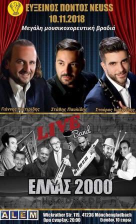 Μεγάλη μουσικοχορευτική βραδιά διοργανώνει ο ποντιακός σύλλογος «Εύξεινος Πόντος» Neuss το Σάββατο 10 Νοεμβρίου 2018 και με ανακοίνωσή του το διοικητικό συμβούλιο του συλλόγου προσκαλεί τα μέλη και τους φίλους του συλλόγου που βρίσκονται στη Γερμανία να παρευρεθούν και να γλεντήσουν όλοι μαζί σαν μια οικογένεια.