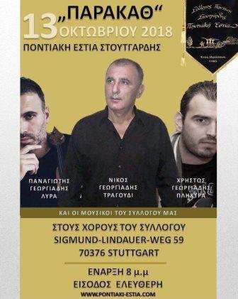 Σε «Παρακάθ’», προσκαλεί η Ποντιακή Εστία Στουτγάρδης, τα μέλη και τους φίλους του συλλόγου, προκειμένου να ζήσουν μια βραδιά γεμάτη από ήχους και χρώματα της μουσικής του αλησμόνητου Πόντου, στην ξενιτειά, στην πρωτεύουσα του κρατιδίου της Βάδης – Βυρτεμβέργης στη Γερμανία.
