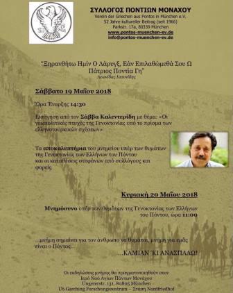Συγκέντρωση και πορεία μνήμης για τη γενοκτονία των Ελλήνων του Πόντου για το 2018, πραγματοποιούν οι ποντιακοί σύλλογοι «Δωδεκάπολις» της Βάδης Βυρτεμβέργης, με συγκέντρωση και πορεία στους δρόμους της πόλης και κατάθεση στεφάνων και ομιλίες στην πλατεία και στο μνημείο των ολοκαυτωμάτων, στο κέντρο της Στουτγάρδης.