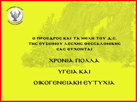 Χριστουγεννιάτικες ευχές προς όλους στέλνει η Εύξεινος Λέσχης Θεσσαλονίκης, το ιστορικό σωματείο της πόλης που έχει αφήσει το αποτύπωμά της σε δύσκολες στιγές από την περίοδο της κατοχής μέχρι σήμερα, στεκόμενο αρωγός στους ασθενέστους και τους κατατρεγμένους αυτού του κόσμου, διαχρονικά.