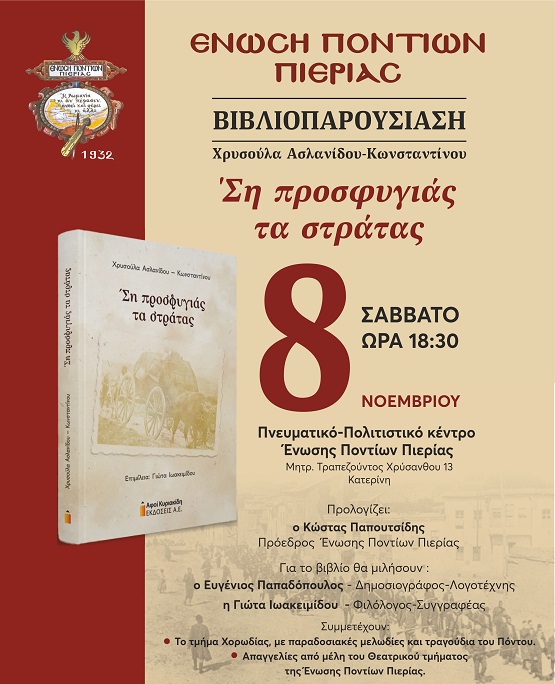 Το βιβίο της Χρυσούλας Ασλανίδου – Κωνσταντίνου «΄Ση προσφυγιάς τα στράτας» θα παρουσιαστεί το απόγευμα του Σαββάτου 8 Νοεμβρίου 2025, στην Ένωση Ποντίων Πιερίας.