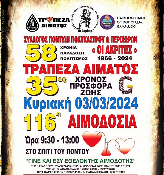 Συνεχίζοντας την προσφορά προς τον συνάνθρωπο, ο Σύλλογος Ποντίων Πολυκάστρου και Περιχώρων “Οι Ακρίτες” μέσω της Τράπεζας Αίματος που λειτουργεί με επιτυχία εδώ και δεκαετίες, προγραμματίζουν την επόμενη εθελοντική αιμοδοσία την Κυριακή 3 Μαρτίου 2024.
