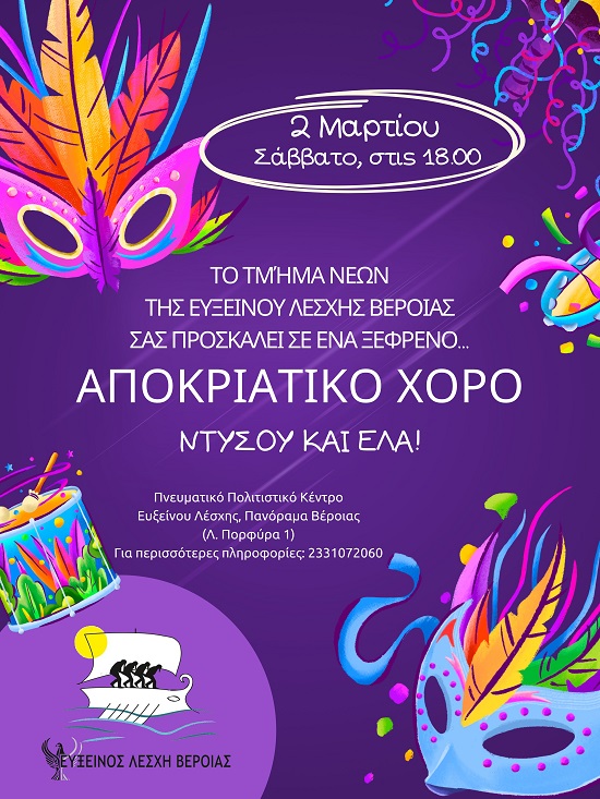 Το αποκριάτικο παιδικό πάρτι, έναν θεσμό που έχει καθιερώσει η Εύξεινος Λέσχη Βέροιας, θα πραγματοποιηθεί και φέτος το απόγευμα του Σαββάτου 2 Μαρτίου 2024, στο Πνευματικό Κέντρο στο Πανόραμα.