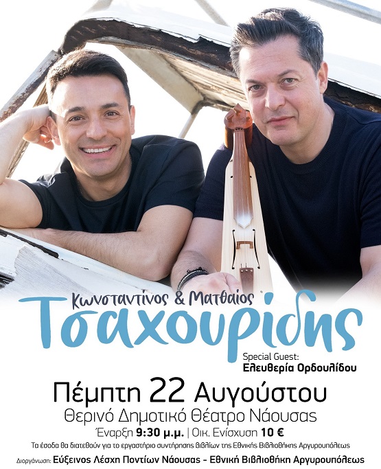 Μία μοναδική συναυλία με τίτλο «Μαζί, με τα τραγούδια που αγαπάμε…» διοργανώνει η Εύξεινος Λέσχη Ποντίων Νάουσας – Εθνική Βιβλιοθήκη Αργυρουπόλεως «Ο Κυριακίδης», με τους Κωνσταντίνο και Ματθαίο Τσαχουρίδη, και special guest την Ελευθερία Ορδουλίδου, στο Θερινό Δημοτικό Θέατρο Νάουσας, την Πέμπτη 22 Αυγούστου 2024 στις 21:30.