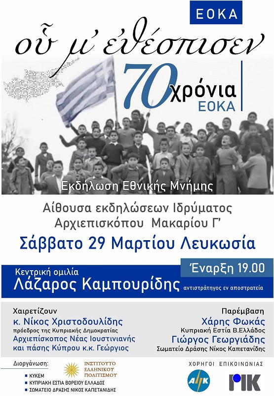 Εκδήλωση με αφορμή τη συμπλήρωση 70 χρόνων από την έναρξη του Εθνικοαπελευθερωτικού Αγώνα της ΕΟΚΑ για την Ένωση της Κύπρου με την Ελλάδα, πραγματοποιείται στην Λευκωσία το Σάββατο 29 Μαρτίου 2025, την οποία διοργανώνουν το Ινστιτούτο Ελληνικού Πολιτισμού Κύπρου, το ΚΥΚΕΜ, η Κυπριακή Εστία Βορείου Ελλάδος και το σωματείο Δράσης “Νίκος Καπετανίδης”.