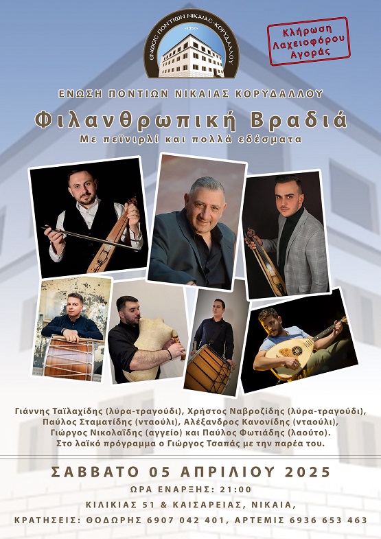 Φιλανθρωπική Βραδιά με Πεϊνιρλί πλούσιο μενού και φυσικά Ποντιακό και Λαϊκό μουσικό πρόγραμμα, διοργανώνει η Ένωση Ποντίων Νίκαιας - Κορυδαλλού το βράδυ του Σαββάτου 5 Απριλίου 2025 και με ανακοίνωσή της προσκαλεί τα μέλη και τους φίλους του συλλόγου να παρευρεθούν και να ενισχύσουν την προσπάθεια του σωματείου.