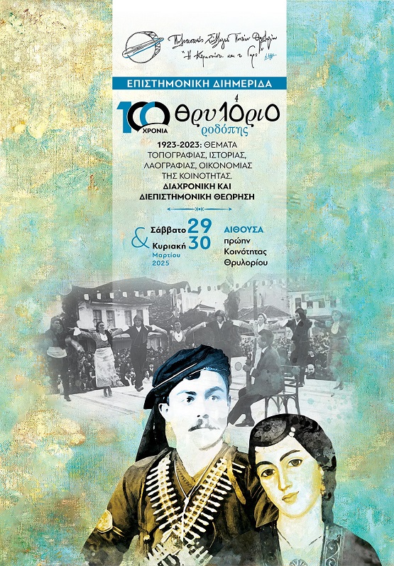 Επιστημονική Διημερίδα με θέμα 100 χρόνια Θρυλόριο Ροδόπης, 1923-2023: θέματα Τοπογραφίας, Ιστορίας, Λαογραφίας, Οικονομίας της κοινότητας. Διαχρονική και διεπιστημονική θεώρηση, διοργανώνεται το Σάββατο 29 – Κυριακή 30 Μαρτίου 2025, στην αίθουσα εκδηλώσεων της πρώην Κοινότητας Θρυλορίου, σε μία διοργάνωση που στηρίζουν ο Δήμος Κομοτηνής και Αλέξανδρος Α.Τ.Ε.Β.Ε.