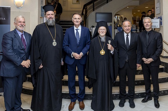 Διακρίνονται, από αριστερά, ο διευθυντής της Αγιορειτικής Εστίας Αναστάσιος Ντούρος, ο Οικουμενικός Πατριάρχης κ.κ. Βαρθολομαίος, ο Δήμαρχος Θεσσαλονίκης και πρόεδρος του Διοικητικού Συμβουλίου της Αγιορειτικής Εστίας Στέλιος Αγγελούδης και ο ζωγράφος Γιώργος Ταξίδης.