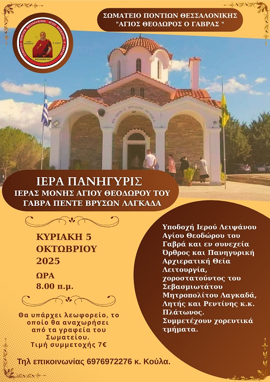 Την Κυριακή 5 Οκτωβρίου 2025, θα πραγματοποιηθεί η Ιερά Πανήγυρη στην Ιερά Μονή Αγίου Θεόδωρου Γαβρά, στο χωριό Πέντε Βρύσες Λαγκαδά του νομού Θεσσαλονίκης.