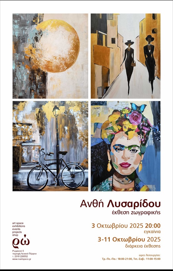 Ατομική έκθεση ζωγραφικής της Ανθής Λυσαρίδου στη γκαλερί ΡΩ της Θεσσαλονίκης, πραγματοποιείται από σήμερα Παρασκευή 3 έως το Σάββατο 11 Οκτωβρίου 2025.