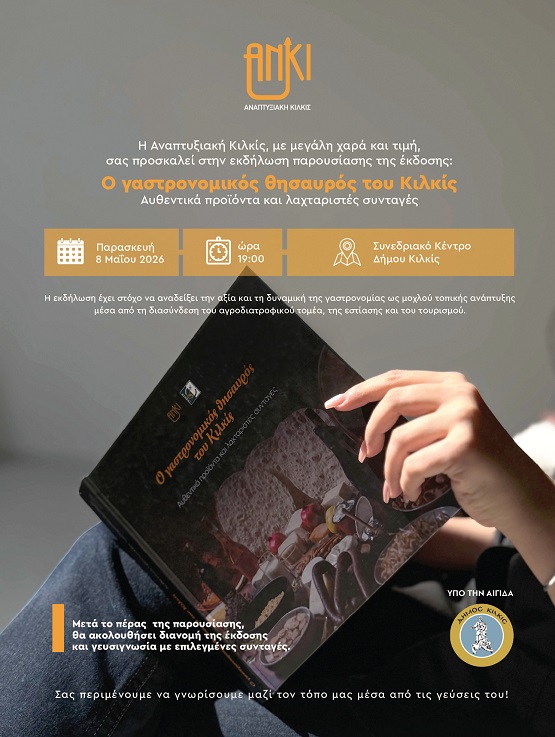 Η Αναπτυξιακή Κιλκίς διοργανώνει εκδήλωση παρουσίασης της νέας της έκδοσης: «Ο γαστρονομικός θησαυρός του Κιλκίς – Αυθεντικά προϊόντα και λαχταριστές συνταγές», την Παρασκευή 8 Μαΐου 2026 και ώρα 19:00, στο Συνεδριακό Κέντρο του Δήμου Κιλκίς.