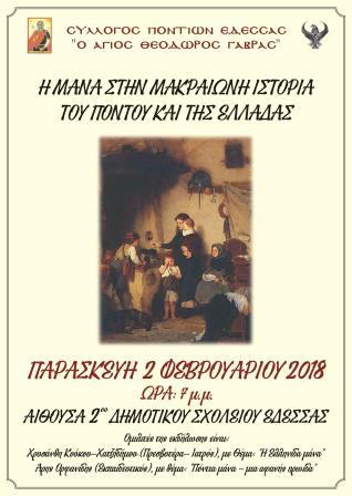 «Η Μάνα στη μακραίωνη ιστορία του και της Ελλάδας», είναι το θέμα της εκδήλωσης, που πραγματοποιεί ο σύλλογος Ποντίων Έδεσσας «Ο Άγιος Θεόδωρος Γαβράς», την Παρασκευή 2 Φεβρουαρίου 2018, στις 7 το βράδυ.