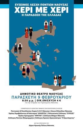 Μουσικοχορευτική παράσταση, φιλανθρωπικού χαρακτήρα, με τίτλο «ΧΕΡΙ ΜΕ ΧΕΡΙ, η παράδοση της Ελλάδας», διοργανώνει η Εύξεινος Λέσχη Ποντίων Νάουσας, η οποία θα πραγματοποιηθεί την Παρασκευή 9 Φεβρουαρίου και ώρα 8:30 μ.μ. στο Δημοτικό Θέατρο Νάουσας.
