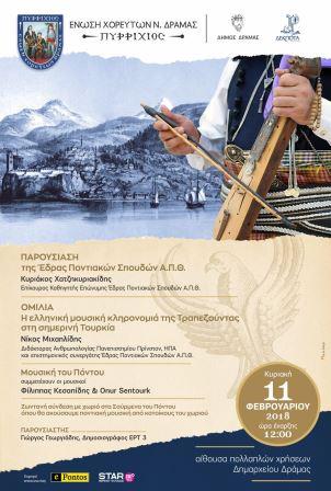 Εκδήλωση παρουσίασης της Έδρας Ποντιακών Σπουδών του ΑΠΘ και μια ομιλία για την μουσική κληρονομιά της Τραπεζουντας στη σημερινή Τουρκία, πραγματοποιεί στη Δράμα, η Ένωση Χορευτών Δράμας ΠΥΡΡΙΧΙΟΣ συνεχίζοντας δυναμικά και το 2018 στην ανάδειξη του ποντιακού ελληνισμού.