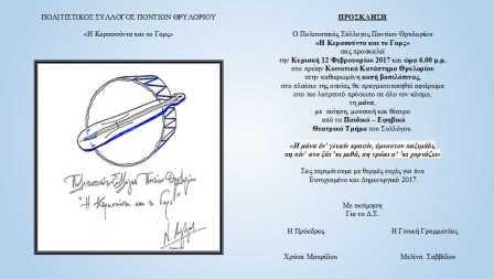Στο πλαίσιο της εκδήλωσης κοπής της βασιλόπιτας το θεατρικό τμήμα του συλλόγου, θα παρουσιάσει το θεατρικό μονόπρακτο του Σάββα Σαλπιγγίδη «Αλεπέσα και Φουτέσα».