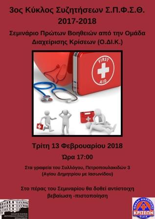 Ο Σύλλογος Ποντίων Φοιτητών και Σπουδαστών Θεσσαλονίκης, στο πλαίσιο της ευρύτερης πολιτιστικής και κοινωνικής του δράσης, συνεχίζει τους κύκλους συζητήσεων του για το τρέχον ακαδημαϊκό έτος. Θέμα του τρίτου κύκλου αποτελεί η πραγματοποίηση σεμιναρίου πρώτων βοηθειών, καθώς η αντιμετώπιση αναπάντεχων ασθενειών, κοινών τραυματισμών και δυσλειτουργιών του ανθρώπινου οργανισμού αποτελεί αναγκαία γνώση της καθημερινής ζωής του καθενός και θα πραγματοποιηθεί την Τρίτη 13 Φεβρουαρίου 2018.