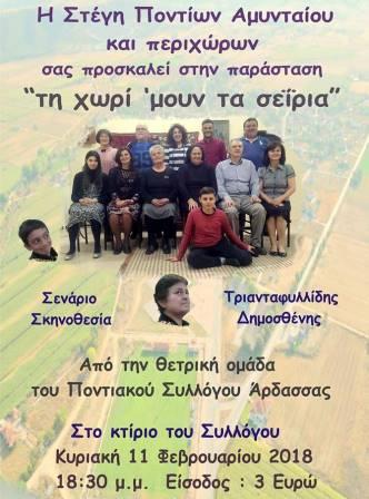 Την θεατρική παράσταση «τη χωρί ‘μουν τα σεΐρια» του ποντιακού συλλόγου Άρδασσα, θα ανεβάσει η Στέγη Ποντίων Αμυνταίου, την Κυριακή 11 Φεβρουαρίου 2018.