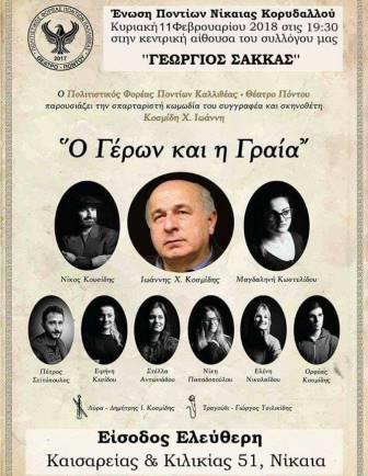 Τη θεατρική παράσταση «Ο Γέρον και η Γραία», του πολιτιστικού φορέα Καλλιθέας, Θέατρο Πόντου, του συγγραφέα και σκηνοθέτη Ιωάννη Χ. Κοσμίδη, θα παρουσιαστεί στην Ένωση Ποντίων Νίκαιας – Κορυδαλλού, στην κεντρική αίθουσα του συλλόγου «Γέωργιος Σακκάς», την Κυριακή 11 Φεβρουαρίου 2018, στις 19.30 το βράδυ.