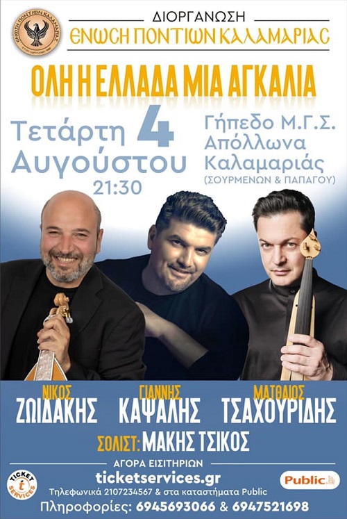 Πόντος, Κρήτη και Ήπειρος, «Όλη η Ελλάδα μια αγκαλιά», είναι το μουσικό θέαμα που μπορούν να παρακολουθήσουν, όσοι θα βρεθούν στο γήπεδο του Απόλλωνα Καλαμαριάς, για να δουν από κοντά που δένονται η ποντιακή με την κρητική λύρα, αλλά και το ηπειρώτικο κλαρίνο, σε μία εκδήλωση που διοργανώνει η Ένωση Ποντίων Καλαμαριάς.