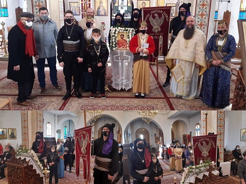 Μέλη του χορευτικού τμήματος του Φάρου Ποντίων πλαισίωναν τιμητικά την Ιερά Εικόνα του Αγίου Ευγενίου, ενώ αρκετά ήταν τα μέλη του συλλόγου που προσκύνησαν και άναψαν ένα κερί στη μνήμη του.