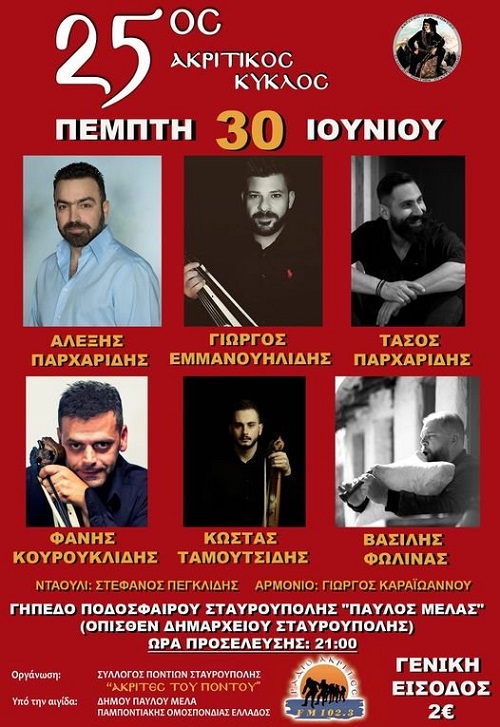 Ο 25ος Ακριτικός Κύκλος του Συλλόγου Ποντίων Σταυρούπολης “Ακρίτες του Πόντου”, αρχίζει σήμερα Πέμπτη 30 Ιουνίου έως και την Δευτέρα 4 Ιουλίου 2022, με πλούσιο καλλιτεχνικό πρόγραμμα, που θα καλύψει όλα τα ακούσματα και των πιο απαιτητικών πολιτών.