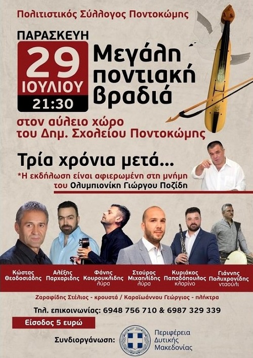 Συγκεκριμένα, ο Πολιτιστικός Σύλλογος Ποντοκώμης διοργανώνει μεγάλη ποντιακή βραδιά, την Παρασκευή 29 Ιουλίου 2022, στις 21.30 το βράδυ, στον αύλειο χώρο του Δημοτικού Σχολείου Ποντοκώμης, σε συνδιοργάνωση με την Περιφέρεια Δυτικής Μακεδονίας.