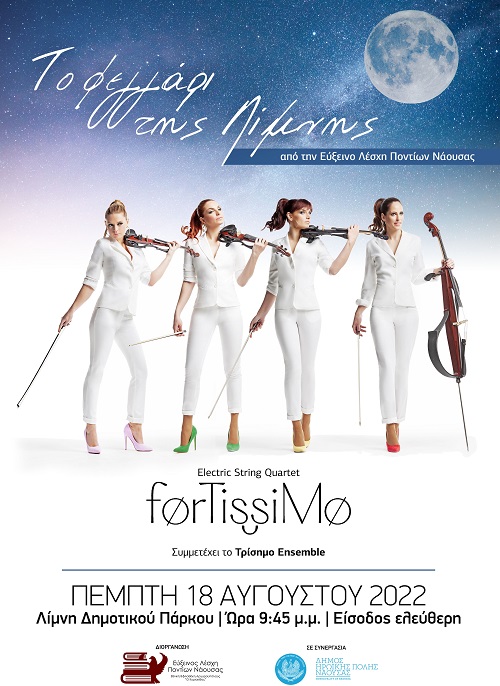 Το κουαρτέτο ηλεκτρικών εγχόρδων Fortissimo θα ταξιδέψει τους θεατές σε διαφορετικά μουσικά μονοπάτια, υπό το φως του Αυγουστιάτικου φεγγαριού και δίπλα στην μαγική ομορφιά της λίμνης του πάρκου.