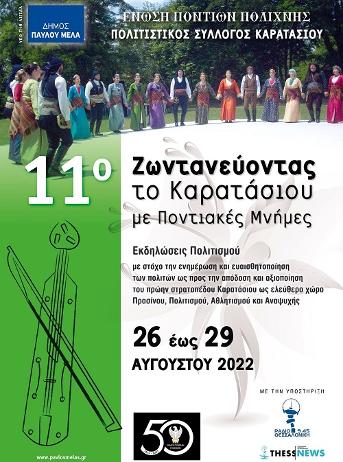 Η Ένωση Ποντίων Πολίχνης και ο Πολιτιστικός Σύλλογος Καρατάσιου, υπό την αιγίδα του Δήμου Παύλου Μελά και την υποστήριξη του Ράδιο Θεσσαλονίκη 94.5, διοργανώνουν το 11ο Φεστιβάλ Πολιτισμού και Παράδοσης «Ζωντανεύοντας το Καρατάσιου με Ποντιακές Μνήμες», από την Παρασκευή 26 έως και τη Δευτέρα 29 Αυγούστου 2022 στο πρώην στρατόπεδο Καρατάσιου.