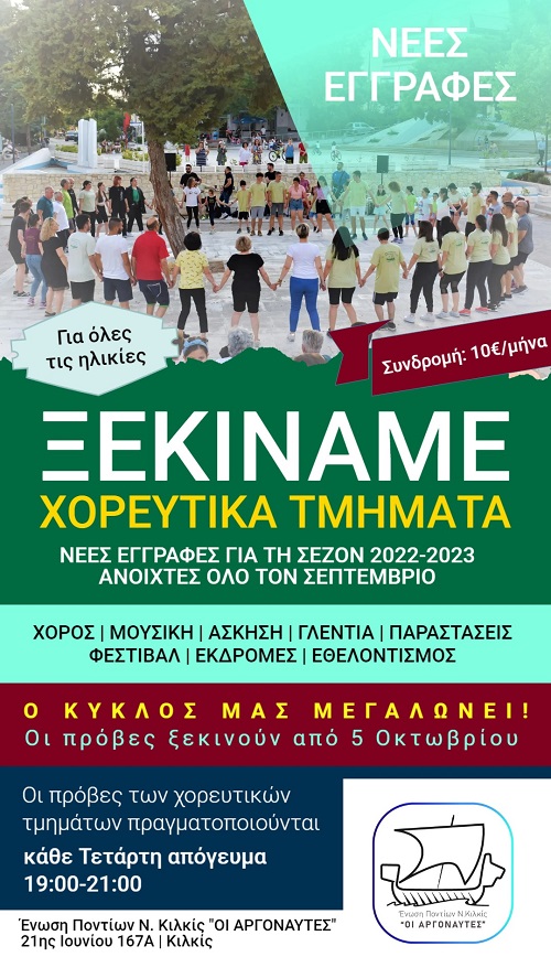 Ξεκίνησαν οι εγγραφές στα τμήματα της Ένωσης Ποντίων Νομού Κιλκίς «ΟΙ ΑΡΓΟΝΑΥΤΕΣ», και το διοικητικό συμβούλιο του συλλόγου, με ανακοίνωσή του προσκαλεί τα μέλη και τους φίλους του συλλόγου να πάρουν μέρος στις δραστηριότητες.