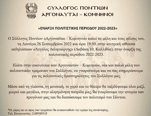 Συγκεκριμένα, με ανακοίνωσή του ο Σύλλογος Ποντίων «Αργοναύται – Κομνηνοί» καλεί τα μέλη και τους φίλους του, σήμερα Δευτέρα 26/9 και ώρα 19:30, στην κεντρική αίθουσα εκδηλώσεων «Άγγελος Δεληγιώργης» (Δαβάκη 10, Καλλιθέα), στην έναρξη της πολιτιστικής περιόδου 2022-2023.
