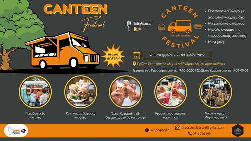 Το πρώτο (1o) Φεστιβάλ Καντίνας – “Canteen Festival”, που θα πραγματοποιηθεί από 28 Σεπτεμβρίου έως 2 Οκτωβρίου 2022, στο πρώην Στρατόπεδο «Μεγ. Αλέξανδρος», διοργανώνουν ο Δήμος Αμπελοκήπων - Μενεμένης και η Κοινωφελής Δημοτική επιχείρηση του Δήμου (ΚΔΕΔΑΜ) σε συνεργασία με την «Thessaloniki Brand», στο πλαίσιο της ανάπτυξης και διάδοσης του πολιτιστικού γαστρονομικού πολιτισμού της περιοχής μας.