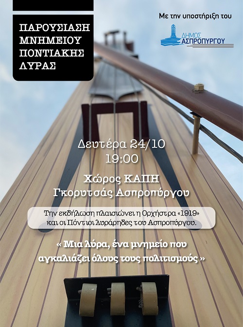 Την Δευτέρα 24 Οκτωβρίου 2022 στις 19:00, στον προαύλιο χώρο του ΚΑΠΗ Γκορυτσάς στον Ασπρόπυργο, θα γίνουν τα αποκαλυπτήρια* και η παρουσίαση του μνημείου της ποντιακής λύρας, με την υποστήριξη του δήμου Ασπροπύργου.