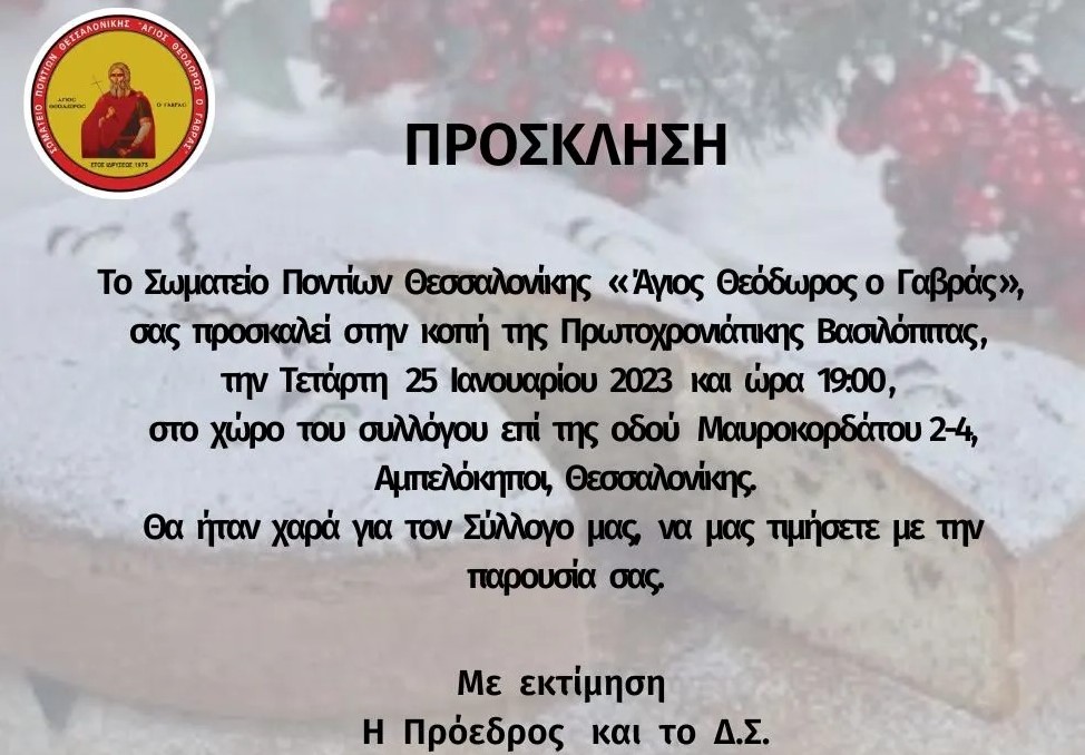 Συγκεκριμένα, το Σωματείο Ποντίων Θεσσαλονίκης «Άγιος Θεόδωρος ο Γαβράς», προσκαλεί τα μέλη και τους φίλους του συλλόγου, στην κοπή της Πρωτοχρονιάτικης Βασιλόπιτας την Τετάρτη 25 Ιανουαρίου 2023 και ώρα 19:00 στο χώρο του συλλόγου (Μαυροκορδάτου 2-4, Αμπελόκηποι Θεσσαλονίκης).