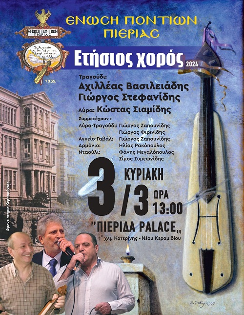 Το Διοικητικό Συμβούλιο της Ένωσης Ποντίων Πιερίας έχει την τιμή και την χαρά να σας προσκαλέσει στον ετήσιο χορό που θα πραγματοποιηθεί την Κυριακή 3 Μαρτίου 2024 και ώρα 13:00 στο οικογενειακό κέντρο “ΠΙΕΡΙΔΑ PALACE”.