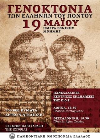 Την Τρίτη 19 Μαΐου ημέρα μνήμης θα πραγματοποιηθεί η κεντρική εκδήλωση της ΠΟΕ στην πλατεία Αγίας Σοφίας. Στις 18.30 το απόγευμα θα γίνει Επιμνημόσυνη Δέηση για τα θύματα της Γενοκτονίας των Ελλήνων του Πόντου, στο μνημείο γενοκτονίας του δήμου Θεσσαλονίκης. Στις 19.00 από την κεντρική εξέδρα της εκδήλωσης χαιρετισμό θα απευθύνουν, ο πρόεδρος της Παμποντιακής Ομοσπονδίας Ελλάδος Χρήστος Τοπαλίδης και ο πρόεδρος της Διεθνούς Συνομοσπονδίας Ποντίων Ελλήνων Γιώργος Παρχαρίδης και θα ακολουθήσει ομιλία από τον Αμερικανό πολιτικό, Σερίφη της κομητείας Μίντλσεξ Μασαχουσέτης, αγωνιστή για την αναγνώριση της Γενοκτονίας των Αρμενίων στις ΗΠΑ Πίτερ Κουτουτζιάν (PeterKoutoujian) και θα ακολουθήσει πορεία προς το τουρκικό προξενείο και επίδοση ψηφίσματος.