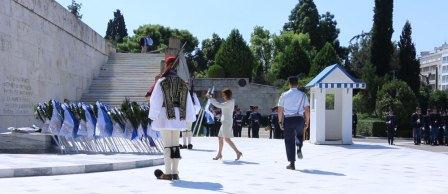 Ακολούθησε πορεία, πάντα υπό τους ήχους της φιλαρμονικής, προς την πλατεία Συντάγματος, όπου έγινε κατάθεση στεφάνων από την ΟΠΣΕ, τους εκπροσώπους των πολιτικών και στρατιωτικών αρχών και δεκάδες σωματεία τόσο της δύναμης της ΟΠΣΕ, όσο και άλλων φορέων.